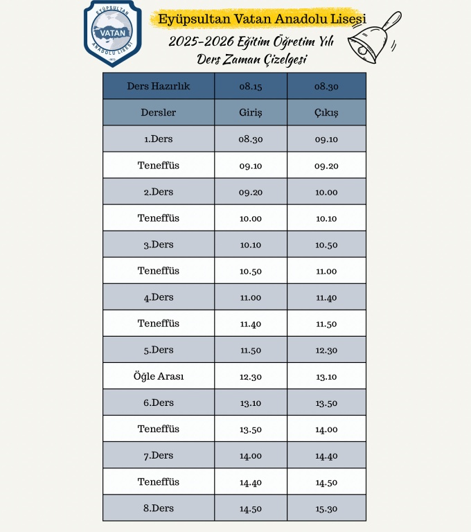 2025-2026 Eğitim Öğretim Yılı Ders Zaman Çizelgesi